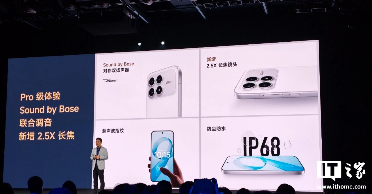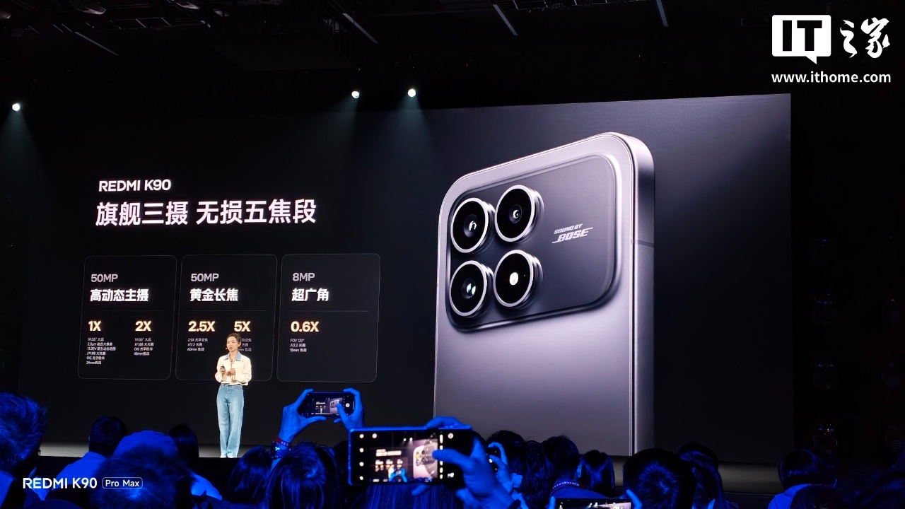 REDMI K90 标准版手机配备旗舰三摄,包含 50MP 高动态主摄 + 50MP 黄金长焦(K 标准版首次搭载 2.5X 长焦镜头)+ 8MP 超广角,支持无损五焦段;新机搭载超线性对称双扬,采用 K90 Pro Max 同款 Sound by Bose 联合调音。