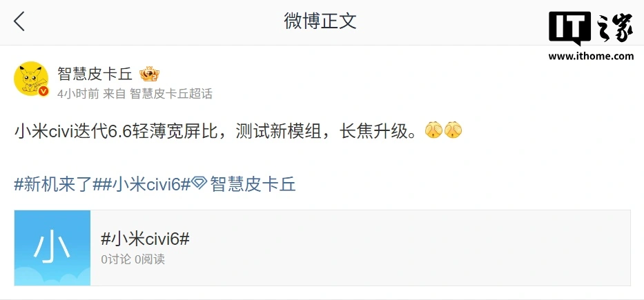 此外,根据博主 @智慧皮卡丘 的说法,小米 Civi 6 手机将升级配置,主打 6.6 英寸轻薄宽屏比,还在测试新模组,长焦升级。