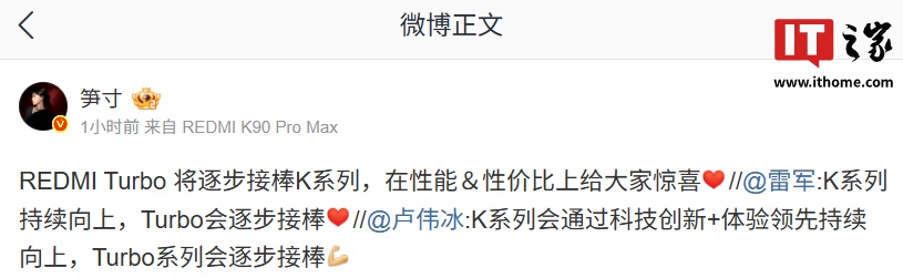 小米集团合伙人、总裁,手机部总裁,小米品牌总经理卢伟冰昨日发文表示:“K 系列会通过科技创新 + 体验领先持续向上,Turbo 系列会逐步接棒。”小米创办人,董事长兼 CEO 雷军也发文称:“K 系列持续向上,Turbo 会逐步接棒。”