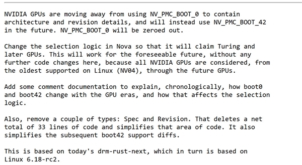 NVIDIA最新提交的Linux补丁之一名为“gpu: nova: add boot42 support for next-gen GPUs”,其中提到,未来的GPU架构和修订版本数据将存储在新的NV_PMC_BOOT_42寄存器中,现在使用的NV_PMC_BOOT_0寄存器同步废弃,其中数据也会清空。