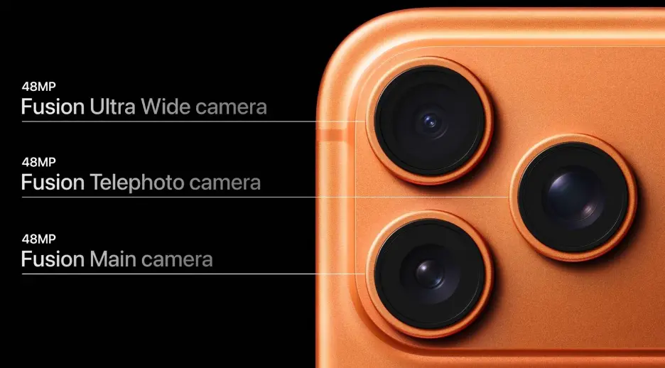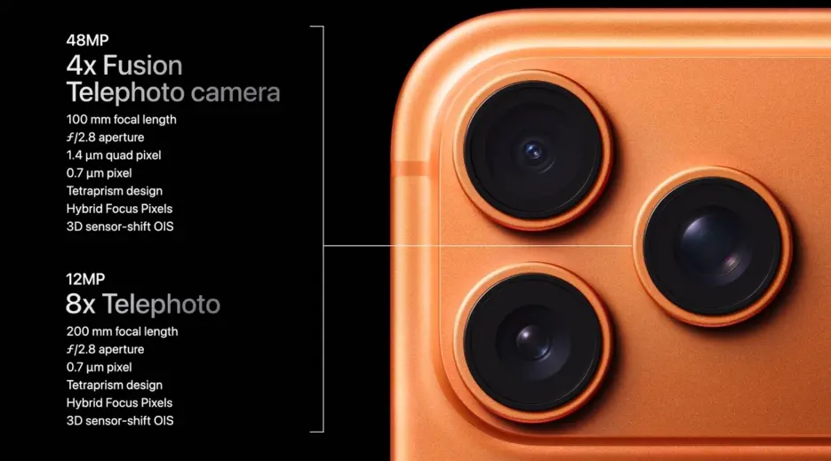 iPhone 17 Pro / Pro Max 系列的前置摄像头依旧采用 1800 万像素的 Center Stage,而后置摄像头首次配备了三颗 4800 万像素的镜头。这三颗镜头也都采用了 Fusion 技术;支持 8 倍光学变焦,以及最高 40 倍数码变焦。