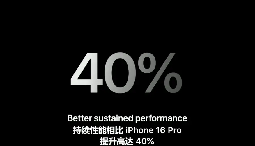 iPhone 17 Pro 系列搭载 A19 Pro 芯片(6 核 CPU + 6 核 GPU,而 iPhone Air 只有 5 核 GPU),搭配全新升级的散热设计,持续性能相比 iPhone 16 Pro 宣称提升 40%。