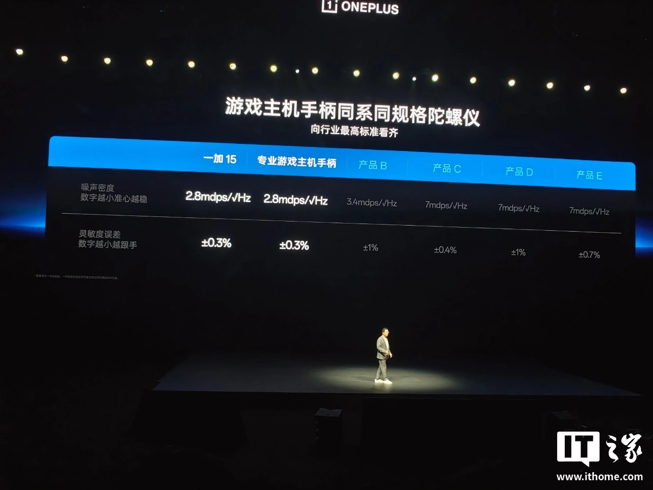 IT之家 10 月 27 日消息,在今晚的一加 15|Ace 6 新品发布会上,一加中国区总裁李杰指出了市面上手机陀螺仪的问题:抖、飘、慢。他表示,手机陀螺仪是 FPS 游戏中的「第三只手」,其两大关键指标是噪声密度和灵敏度误差。