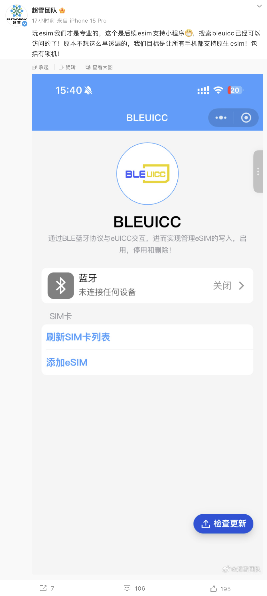 IT之家 10 月 28 日消息,超雪团队发文,称目前其 eSIM 小程序“bleuicc”已正式上线,目标是“让所有手机都支持原生 eSIM,包括有锁机”。参考小程序页面,其中显示该团队使用蓝牙写入 / 启停 eSIM。