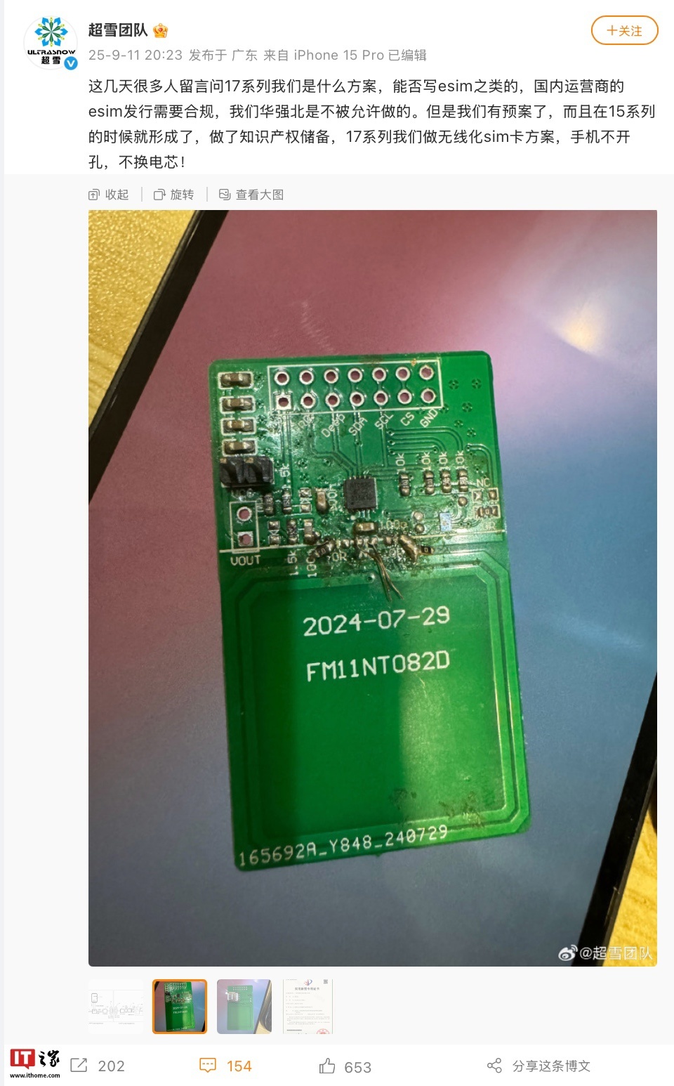 IT之家注意到,今年 9 月时超雪团队便展示了适用于苹果 iPhone Air / iPhone 17 等机型的“无线化 SIM 卡”方案,号称“手机不开孔,不换电芯”。形态方面,相应产品采用 NFC 贴纸方式,厚度为“SIM 卡的厚度”,同时还有望推出“磁吸移动电源”形态高阶产品。