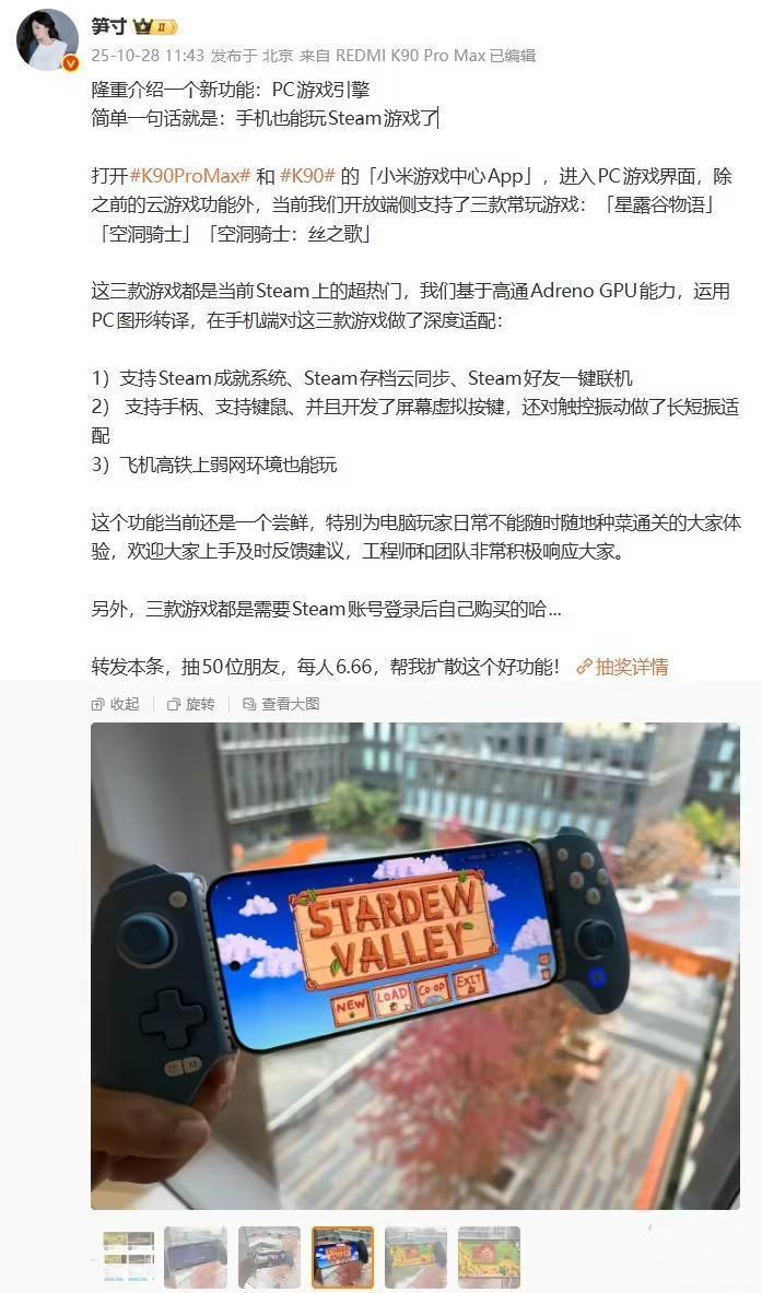 IT之家 10 月 28 日消息,小米 REDMI 产品经理笋寸今日发文介绍了 REDMI K90 系列手机的 PC 游戏引擎,称手机也能玩 Steam 游戏。