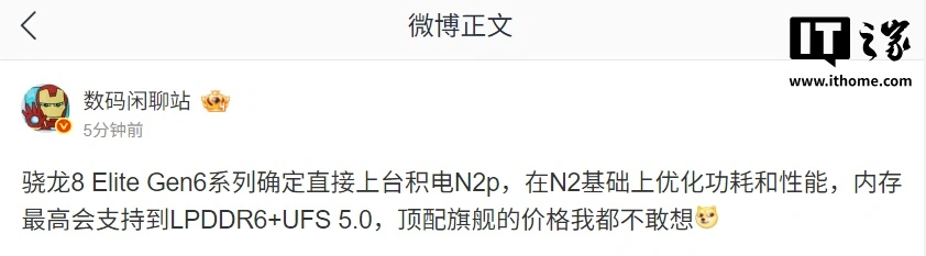 博主 @数码闲聊站 今日发文称,骁龙 8 Elite Gen6 系列确定直接上台积电 N2p,在 N2 基础上优化功耗和性能,内存最高会支持到 LPDDR6+UFS 5.0,“顶配旗舰的价格我都不敢想”。