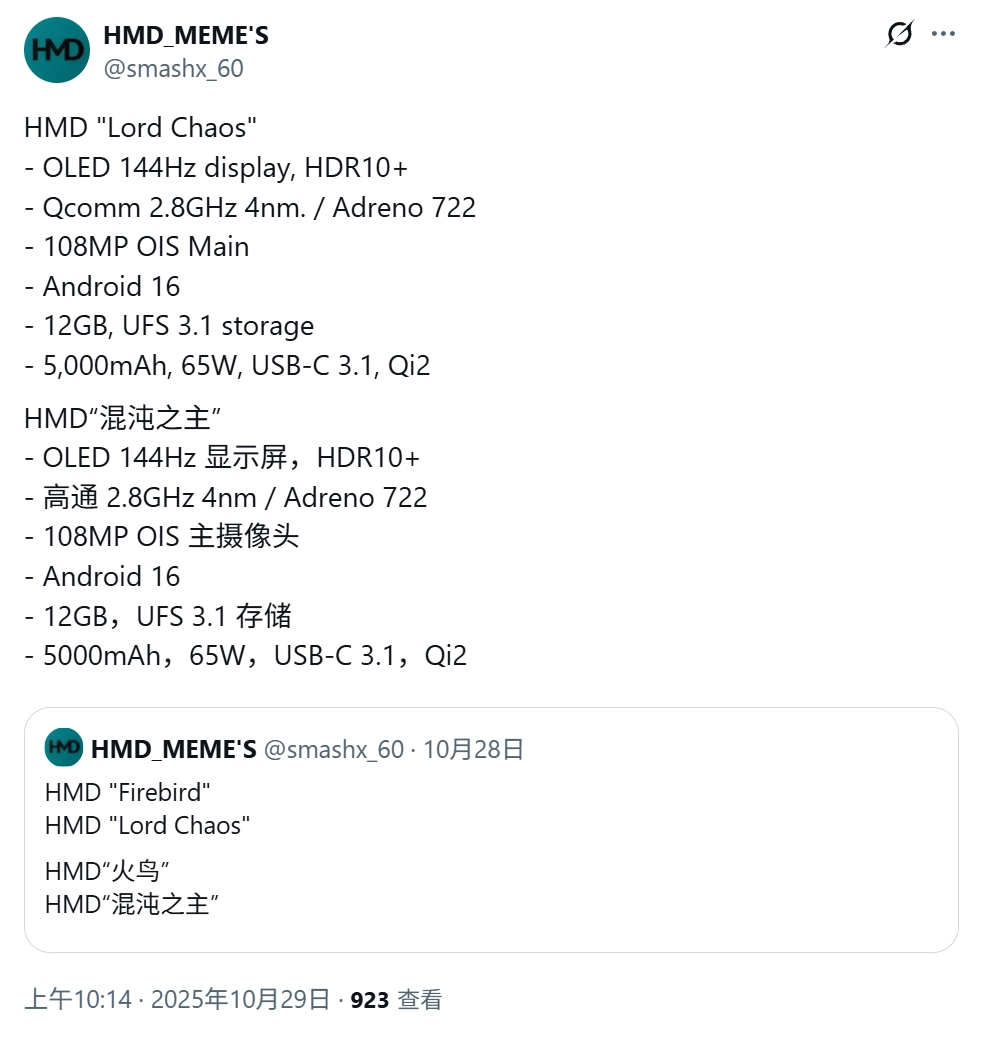 IT之家 10 月 30 日消息,消息源 @smashx_60 昨日(10 月 29 日)在 X 平台发布推文,曝料称 HMD 正研发代号为“Lord Chaos”的中高端智能手机,采用高通骁龙 7 Gen 4 芯片,支持 Qi2 无线充电。