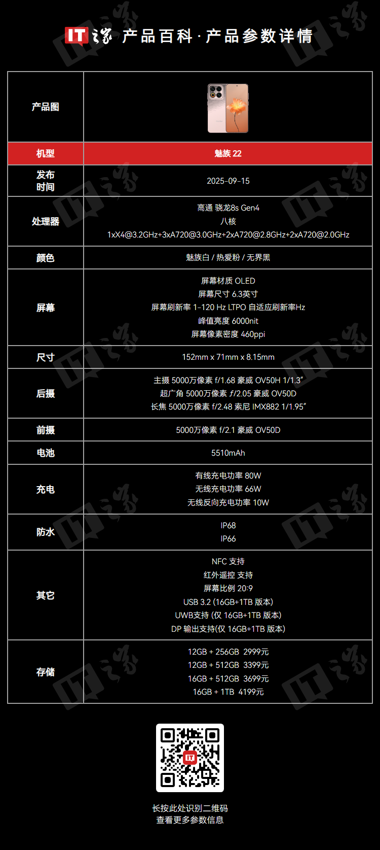 魅族 22 手机于今年 9 月 15 日发布,该机搭载第四代骁龙 8s 处理器、配备 1.5K 高刷无界屏(0.8mm 四等边“独白”面板)、采用 5000 万像素广角 + 5000 万像素 3 倍潜望长焦 + 5000 万像素超广角 + 5000 万像素前置镜头组合,定价 2999 元起。