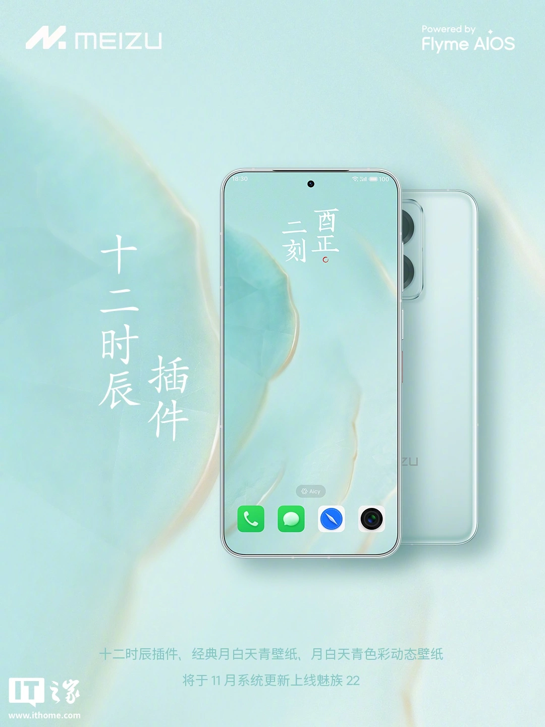 值得一提的是,不只月白天青配色在魅族 22 手机回归,IT之家从魅族 FlymeAIOS 官方微博获悉,其工程师正在加紧努力,让月白天青经典壁纸、月白天青色彩动态壁纸、「十二时辰插件」等在 11 月的系统更新中上线魅族 22(其他机型是否适配暂未公布)。