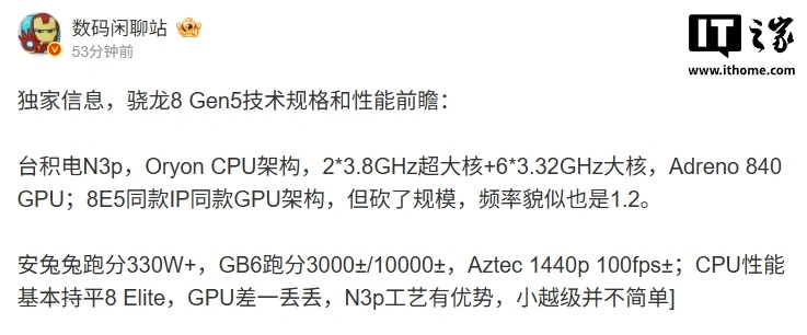 结合IT之家此前援引博主消息,骁龙 8 Gen5 芯片将采用 Oryon CPU 架构,拥有 2*3.8GHz 超大核 + 6*3.32GHz 大核,配备 Adreno 840 GPU,是第五代骁龙 8 至尊版同款架构,但规模被砍,频率“貌似也是 1.2”。