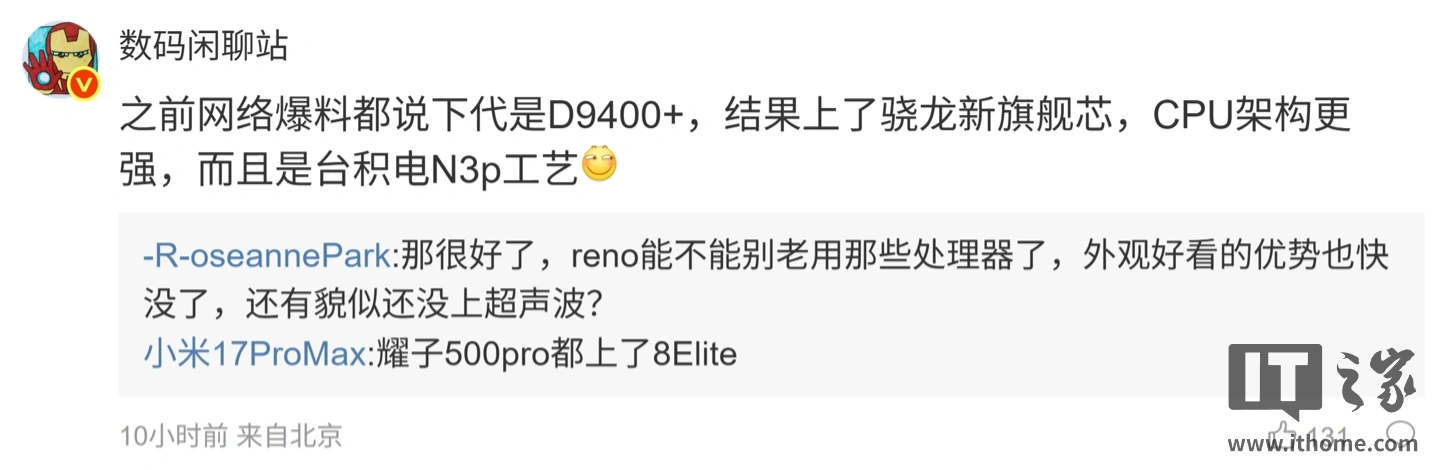后续博主在评论区补充道,之前网络爆料都称这台机器会搭载天玑 9400 + 芯片,结果上了骁龙新旗舰芯,CPU 架构更强,而且是台积电 N3p 工艺。