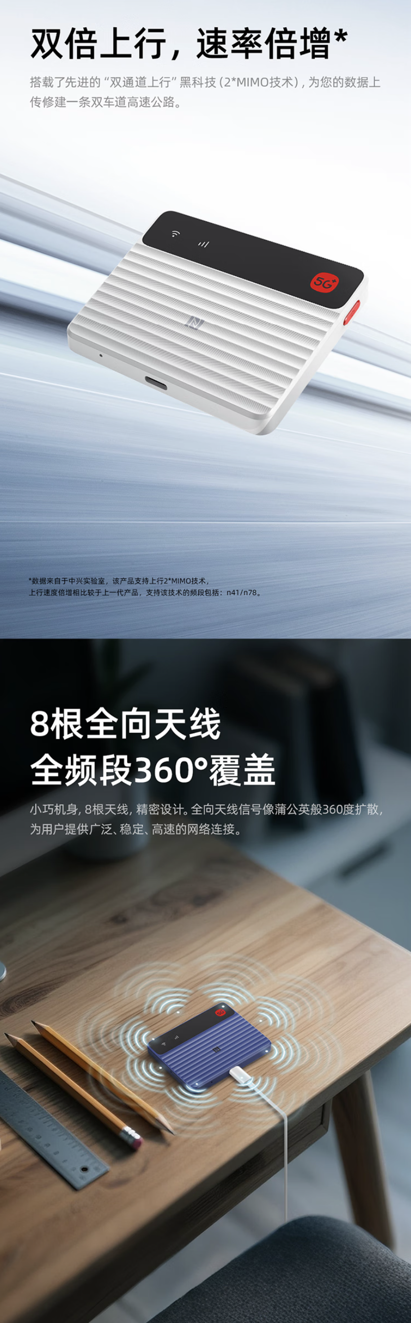 产品搭载 2*MIMO 技术,内置 8 根全向天线,支持 SA+NSA 网络环境和 Sub-6GHz 频段,匹配中兴官方流量卡(用户也可自行插卡),可供 16 台设备同时连接,网速至高可达 500Mbps。