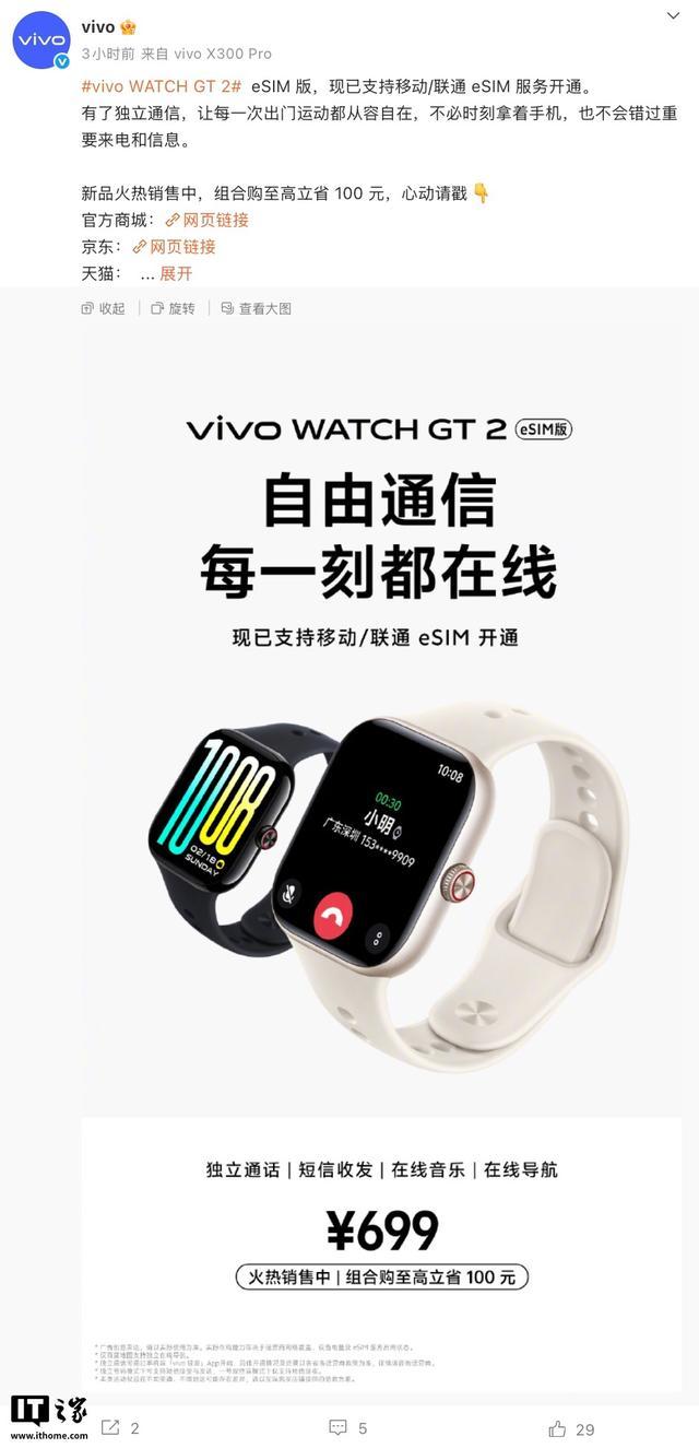 IT之家 10 月 31 日消息,据 vivo 官方微博,vivo WATCH GT 2 智能手表已支持开通移动 / 联通 eSIM 服务,支持一号双终端 / 独立终端双模式。