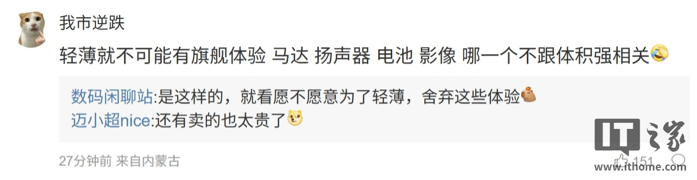 后续有用户在评论区表示:“轻薄就不可能有旗舰体验马达扬声器电池影像哪一个不跟体积强相关