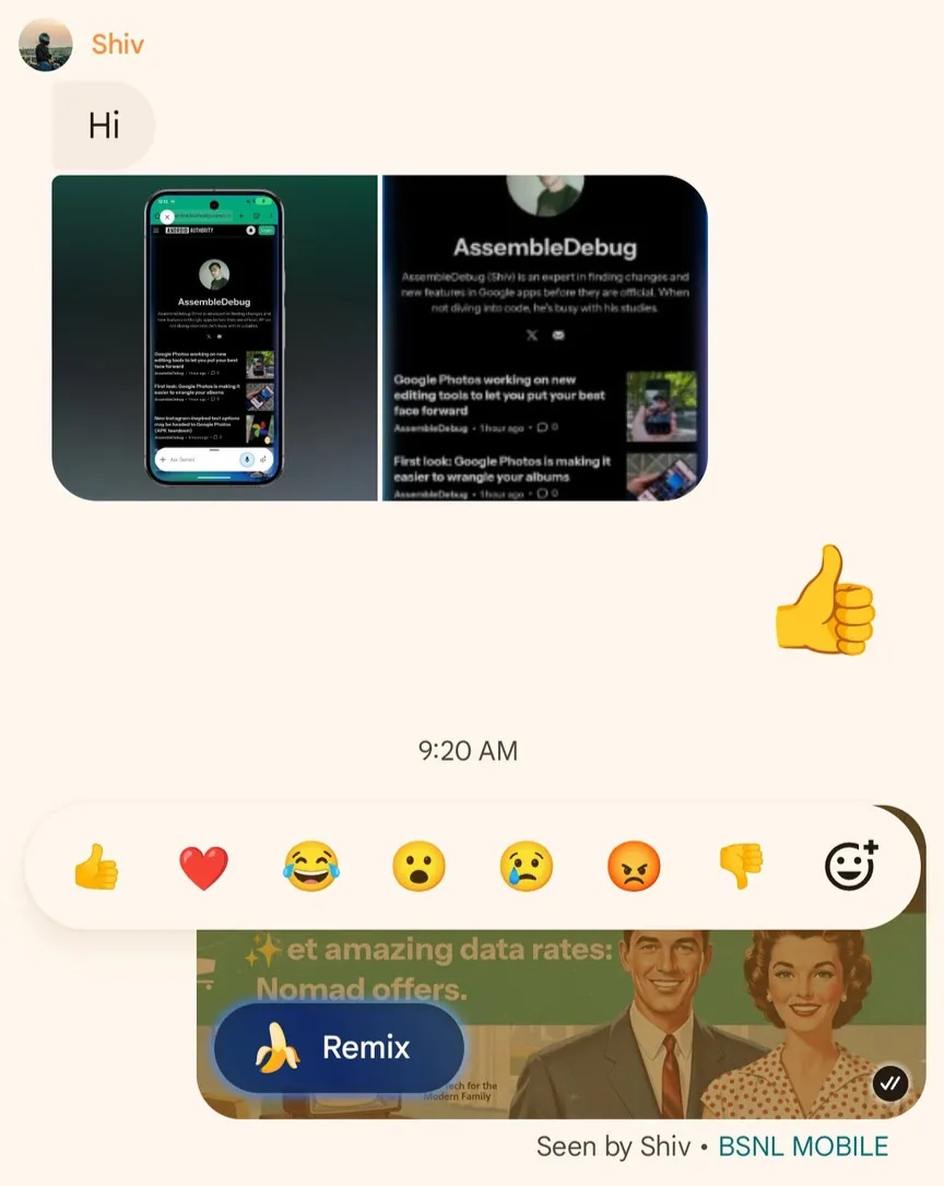 除了通过媒体选择器,用户还可通过另一种更快捷的方式使用该功能。在聊天界面中长按任意一张图片(无论是自己发送的还是接收的),在弹出的快捷反应栏下方即可看到“Remix”按钮,点击后便可直接对该图片进行 AI 再创作。