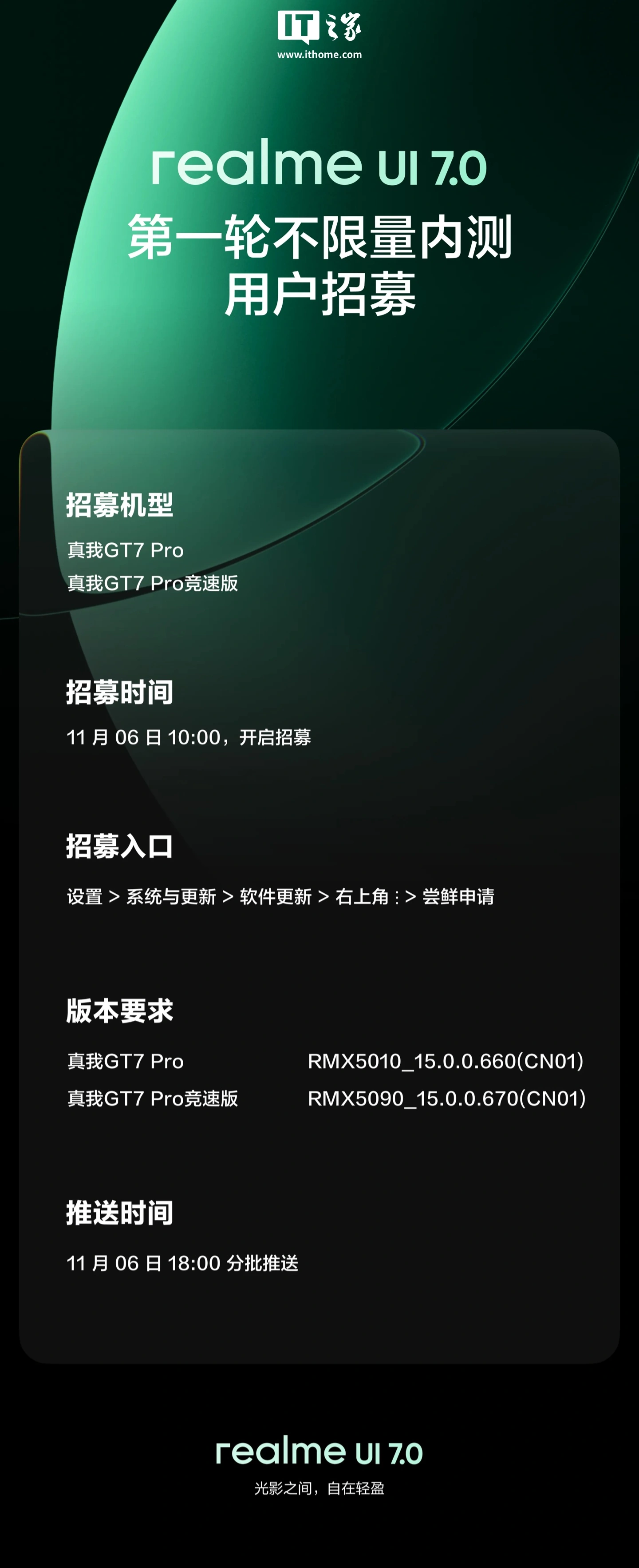 IT之家 11 月 5 日消息,真我社区今日发布公告,宣布 realme UI 7.0 第一轮不限量内测用户招募将于 11 月 6 日(明日)正式开启。realme UI 版主 / 管理员表示,经过工程师慎重评估版本状态、综合体验和性能,选定真我 GT7 Pro、真我 GT7 Pro 竞速版作为第一轮不限量内测招募机型。