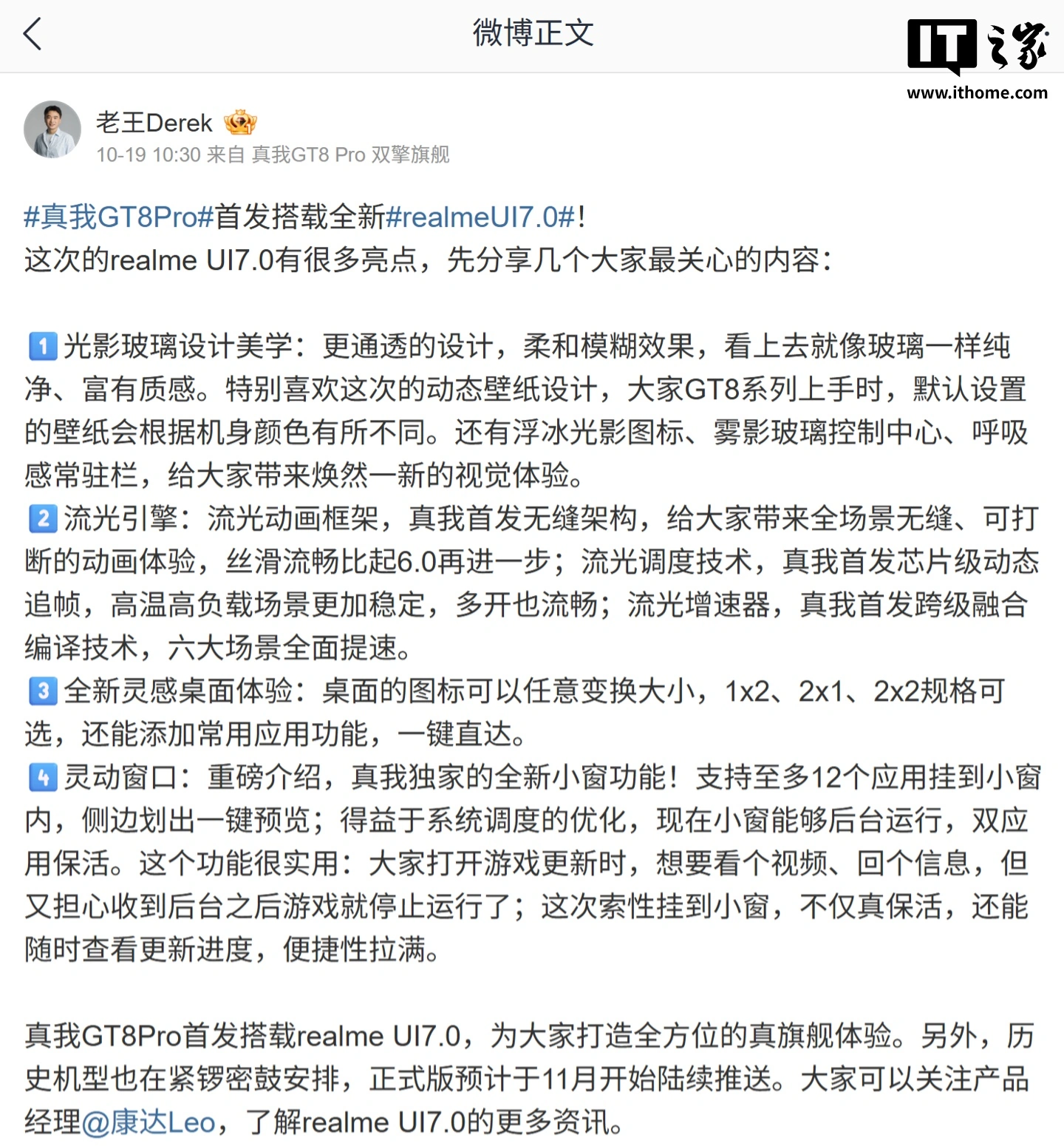 根据规划,真我 GT8 Pro 手机首发搭载 realme UI 7.0 系统,历史机型的正式版系统预计于 11 月开始陆续推送。