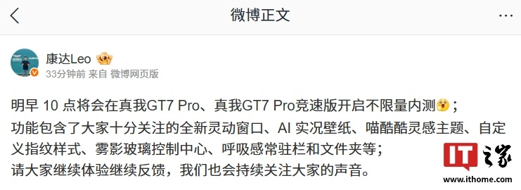 文章来源于互联网:IT之家-realme UI 7.0 第一轮不限量内测用户招募明日开启,首批覆盖真我 GT7 Pro 系列