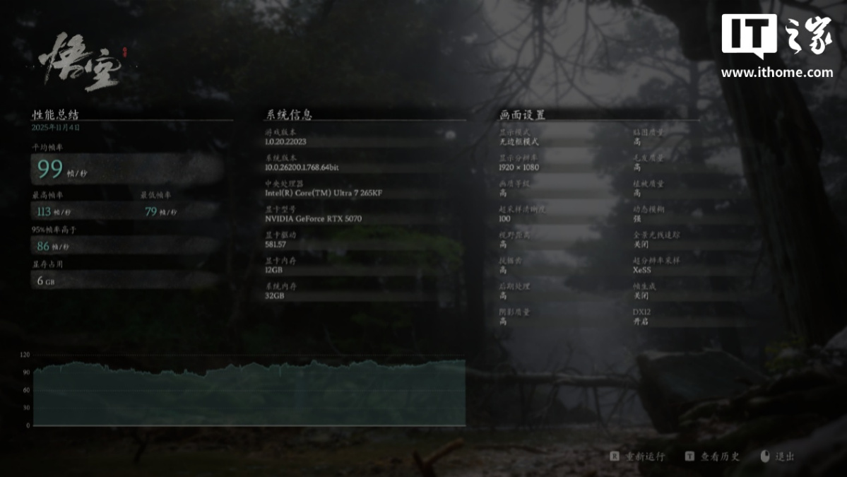 而在“众生平等”的《黑神话:悟空》,以 1080P + 高画质 + 100% XeSS 设置,运行游戏自带的基准测试,游戏平均帧数来到 99 帧,1% Low 也有 76 帧。