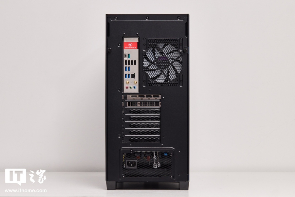 机箱背部的设计中规中矩,挡住了主板的视频输出接口,防止小白插错,I/O 接口面板的配置主打一个够用,包含: