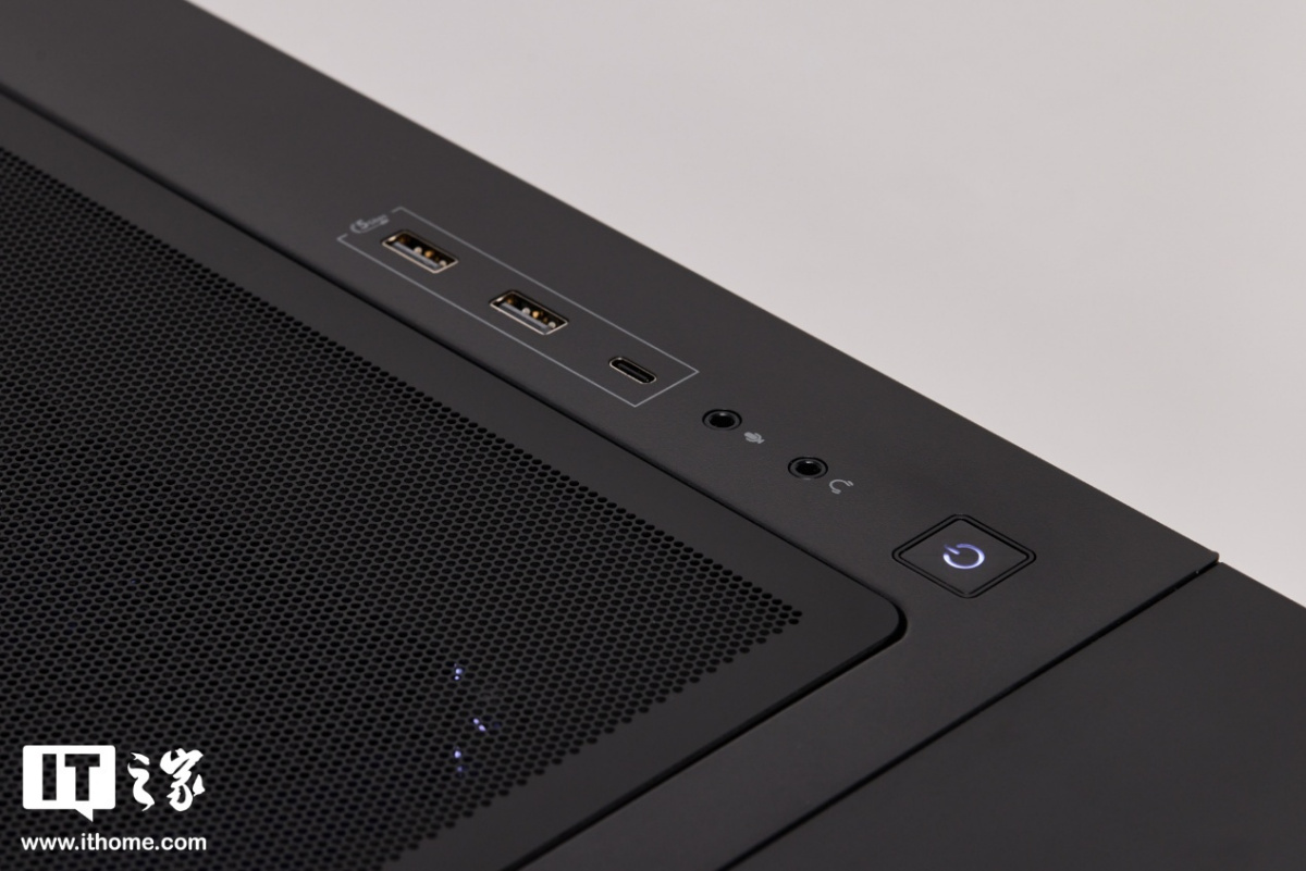 顶部前侧配备 2 个 USB3.2(5G 速率)Type-A 接口和 1 个 USB3.2(5G 速率)Type-C 接口,用于连接外设 2.4G 接收器或 U 盘等设备。还有 1 组 3.5mm 麦克风和有线耳机接口,以及 1 个自带白色指示灯的方形电源键。
