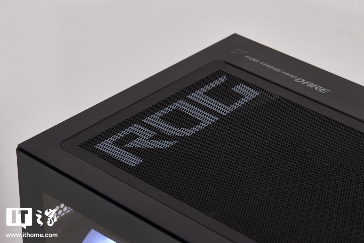 在细节装饰上,ROG 魔霸 9X 遵循非对称布局和简约几何线条处理,彰显其独特个性。机箱顶部铺有一侧印着 ROG 艺术字 Logo 的防尘网,侧边印着 “FOR THOSE WHO DARE” 经典品牌标语。