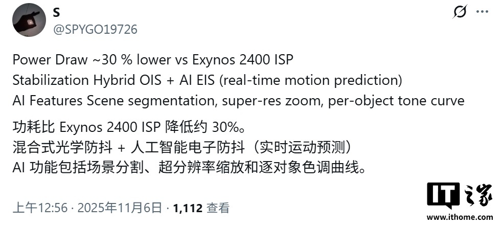 11 月 7 日消息,消息源 @SPYGO19726 昨日(11 月 6 日)在 X 平台发布推文,曝料称三星 Exynos 2600 芯片具备卓越的影像处理能力,可支持 3.2 亿像素单摄像头或三颗 1.08 亿摄像头同时工作,并能以 60fps 录制 8K HDR10+ 视频。