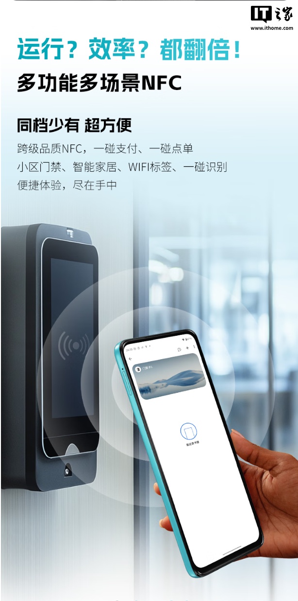 此外,这款手机还配备 NFC 功能,支持录入小区门卡、碰一碰支付等场景,系统还支持应用六开,拥有 256GB 存储空间。