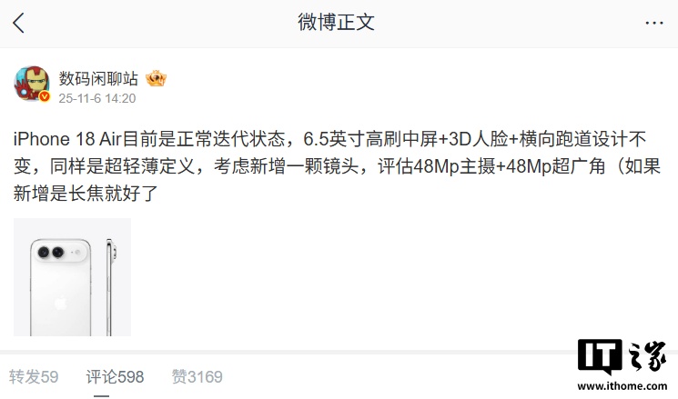 @数码闲聊站 还提到,明年的 iPhone 18 Air 目前是正常迭代状态,工程机采用了 6.5 英寸高刷中屏 + 3D 人脸 + 横向 Deco 设计,同样是超轻薄定义,正考虑新增一颗 48Mp 主摄或 48Mp 超广角镜头。