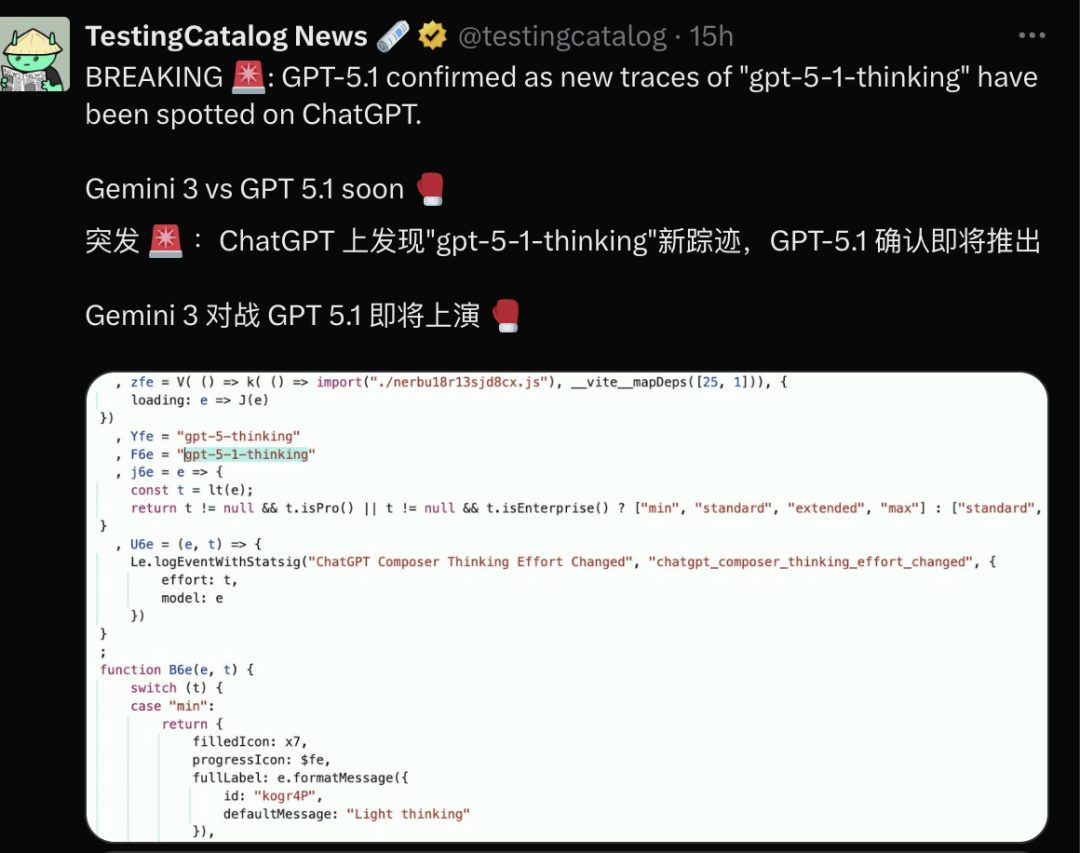 Gemini 3 据说在今年年底前将发布,而 OpenAI 似乎也害怕再像当时的 nano banana 一样,抢走他的市场,计划推出 GPT-5.1。