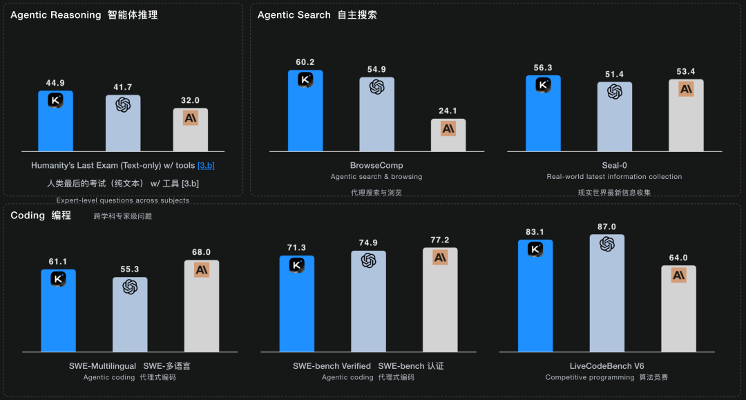 一登场就是斩获多个测试榜单的第一名,Kimi 也不玩开源只和开源比那一套,而是直接把 GPT-5、Claude 4.5 Sonnet 这样的闭源模型放一起,非常自信。