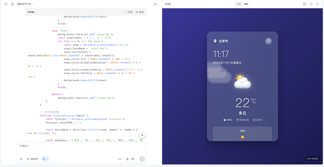 开启长思考,即 K2 Thinking 的同时,能启用网络搜索,当我们要它完成一个天气卡片时,能看到 Kimi 会一边自动检索网络上的公开资料,一边完成代码的实现。