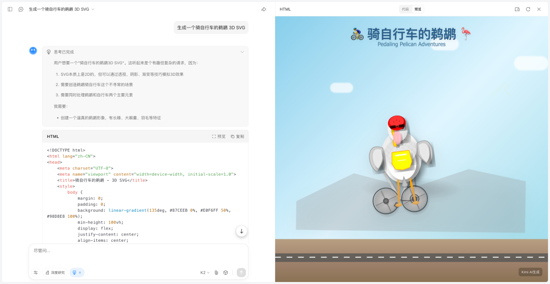 虽然 K2 Thinking 写着推理模型,但是它的推理速度非常快,这段动态的 SVG 代码生成也只花了 1 分钟不到。虽然这个鹈鹕好像有点不太对劲。