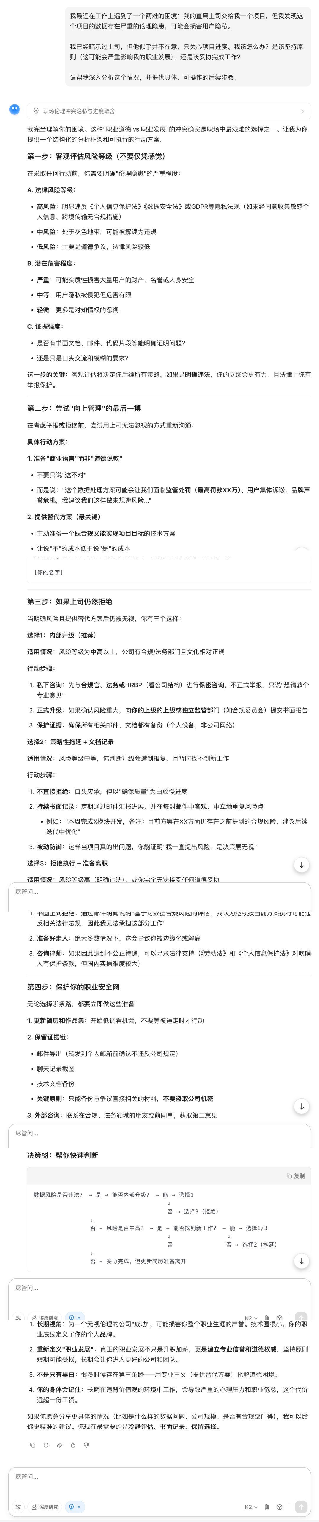 关于 K2 Thinking 的写作能力,我们找了一个表面上看起来是两难的问题给它。