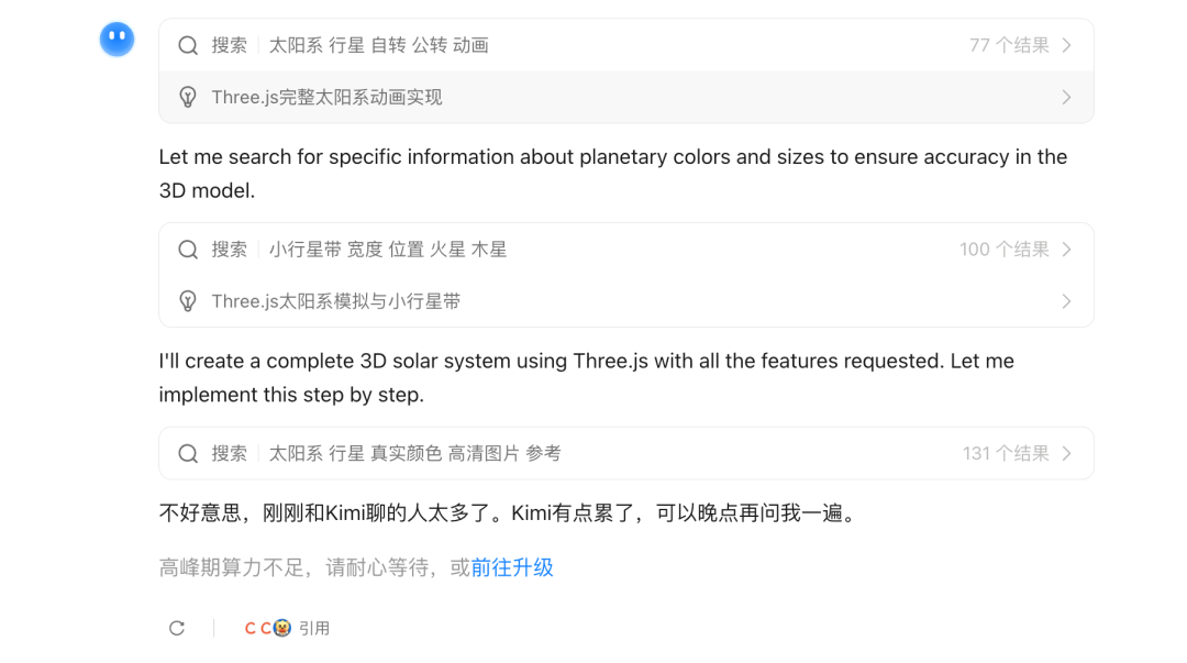 其实工具调用,应该是 Kimi K2 Thinking 非常重要的能力,但是在我们的体验中,发现大多数时候,他只是调用网络搜索工具,而没有看到 200 多个工具流。(我的任务太简单,还有可能是高峰期。)