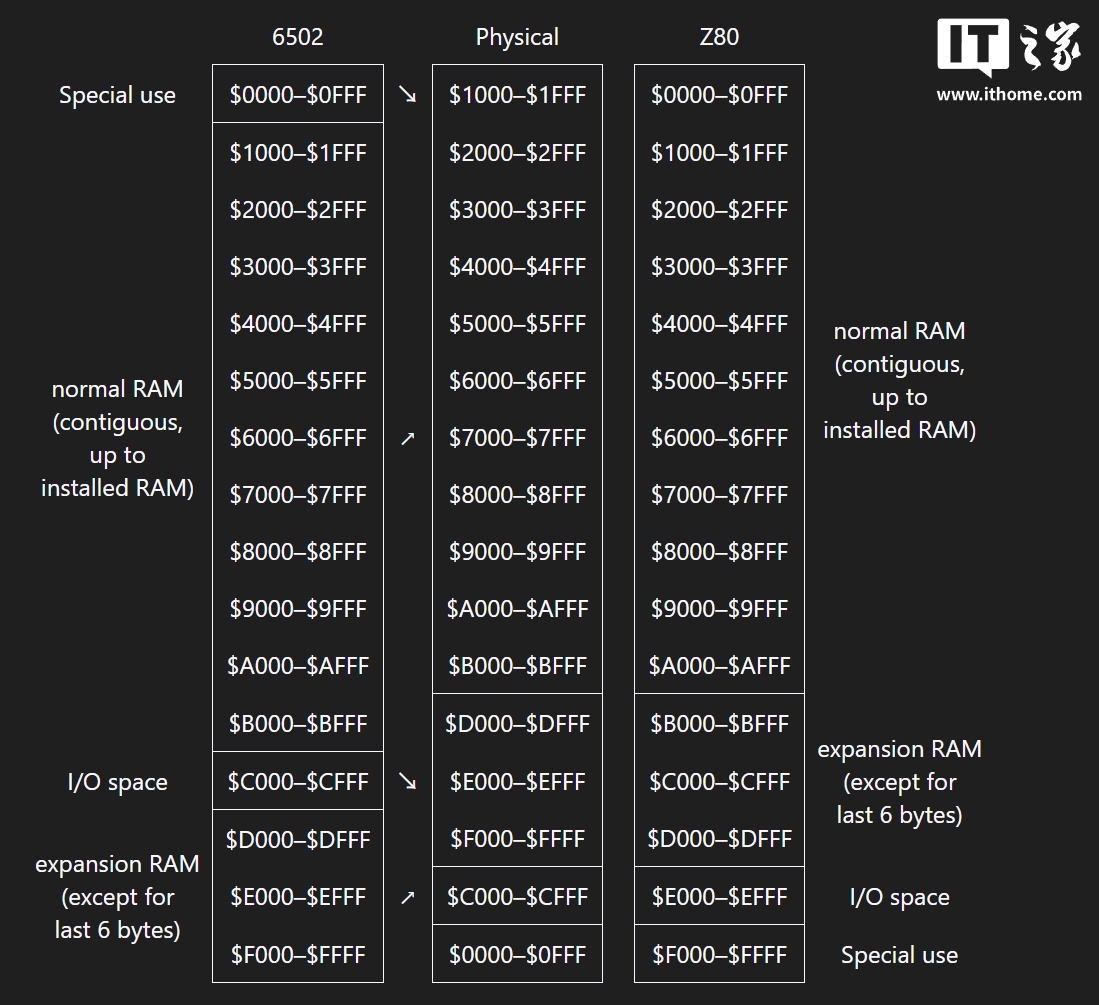 并且,Z80 和 6502 处理器的内存映射方式有所不同,因此简单地把两颗处理器放在一起就会导致巨大问题,为此微软的工程师团队专门在扩展卡上设计了地址转换电路,可以转译 Z80 的内存请求,例如 Z80 请求 $0000 时,扩展卡会将其重映射至 $1000,还能确保 Apple II 本身的特殊保留地址只存在 Z80 内存映射的末尾,两者不会“打架”。