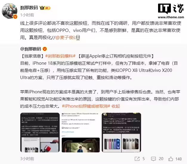 不过 @刹那数码 给出了不同的说法,他强调 iPhone 18 系列的压感模组正常试产打样中。