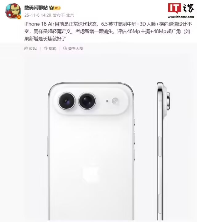 而在昨天(11 月 6 日),微博博主发文透露,iPhone 18 Air 目前是正常迭代状态,6.5 英寸高刷中屏 + 3D 人脸 + 横向跑道设计不变,同样是超轻薄定义,考虑新增一颗镜头,评估 48Mp 主摄 + 48Mp 超广角。