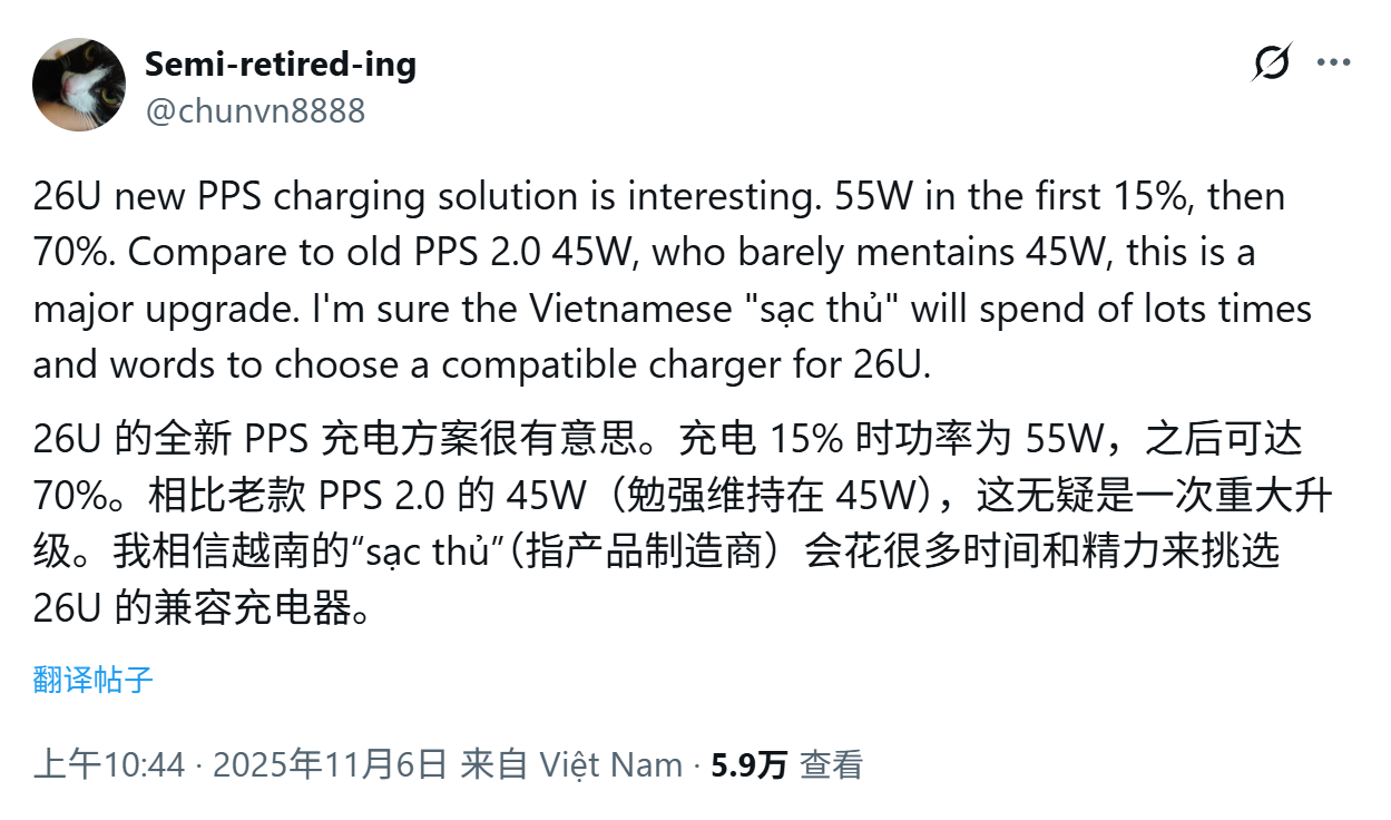 充电方面,Galaxy S26 Ultra 手机将采用全新的 PPS 快充方案,预计官方将宣称支持 60W 充电,实际充电中,在 0-15% 阶段以 55W 功率快充,而在 15-70% 阶段则会把充电功率稳定在 45W,三星现有的 45W 快充方案提升较大。
