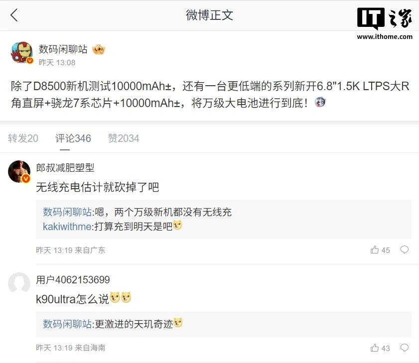 IT之家注意到,该博主曾多次爆料其他的 10000mAh 电池方案,昨日提到将有两款 10000mAh± 电池的新机,其中一款搭载天玑 8500,另一款属于更低端的系列,搭载 6.8 英寸 1.5K LTPS 大 R 角直屏 + 骁龙 7 系芯片。