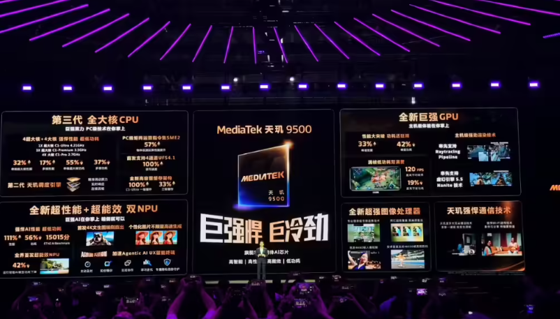 说到联发科天玑 9500 旗舰芯,今年的升级可以说是十分亮眼,其 CPU 采用第三代全大核架构,包含 1 个 4.21GHz C1-Ultra 超大核、3 个 3.5GHz C1-Premium 超大核与 4 个 2.7GHz C1-Pro 大核,三级缓存扩大至 16MB,GeekBench 6 单核跑分超 4000 分、多核超 11000 分,多核性能提升 17% 的同时,峰值功耗下降 37%;配合第二代天玑调度引擎,可实现“响应快速、滑动跟手、画面满帧”的流畅体验。