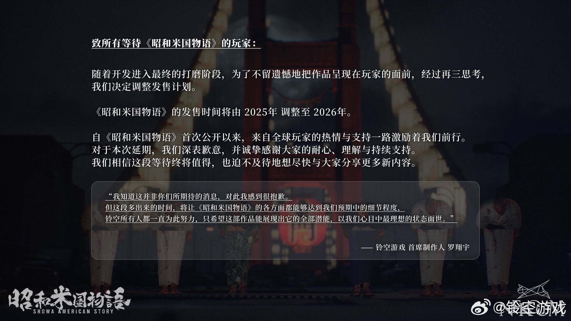 铃空游戏首席制作人罗翔宇表示:“我知道这并非你们所期待的消息,对此我感到很抱歉。但这段多出来的时间,将让《昭和米国物语》的各方面都能够达到我们预期中的细节程度,铃空所有人都一直为此努力,只希望这部作品能展现出它的全部潜能,以我们心目中最理想的状态面世。”