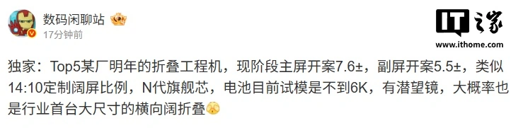 IT之家 11 月 13 日消息,博主 @数码闲聊站 今日曝光 Top5 某厂明年的一款折叠工程机,据称“大概率也是行业首台大尺寸的横向阔折叠”。