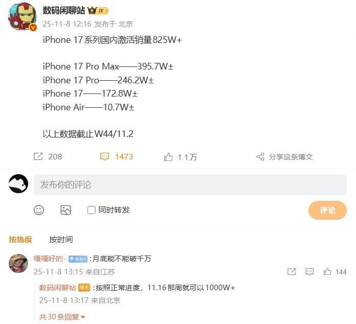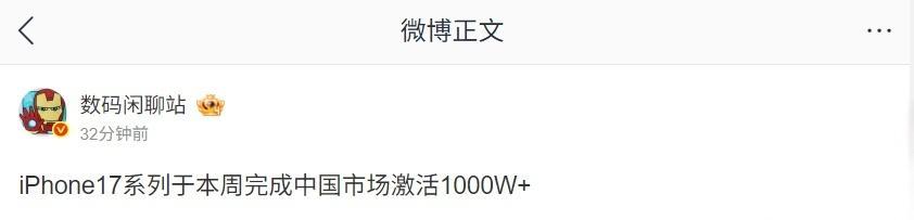 IT之家 11 月 14 日消息,博主 @数码闲聊站 今日发文称,苹果 iPhone 17 系列于本周完成中国市场激活 1000W+。