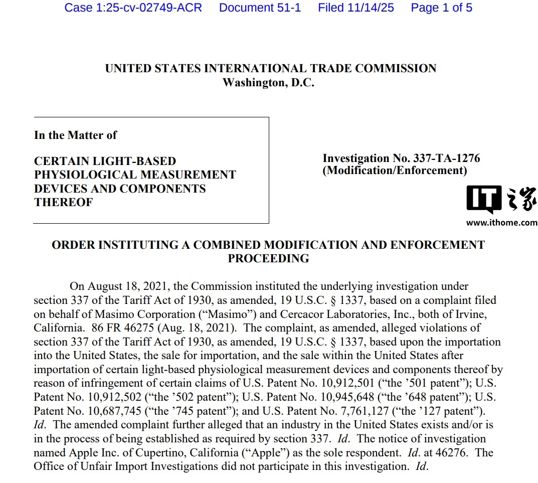 IT之家 11 月 15 日消息,科技媒体 9to5Mac 昨日(11 月 14 日)发布博文,报道称因与健康科技公司 Masimo 的专利纠纷,苹果 Apple Watch 的血氧功能再次面临美国国际贸易委员会(ITC)的审查。