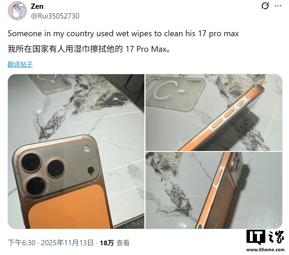 IT之家 11 月 16 日消息,网友 @Rui35052730 于 11 月 13 日在 X 平台发布推文,分享了 3 张照片,称星宇橙 iPhone 17 Pro Max 在使用湿巾清洁后,机身涂层被擦除。