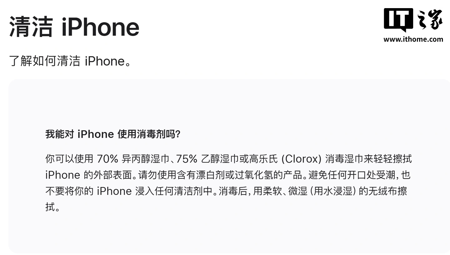 苹果公司也一直建议用户,切勿使用含有强效化学成分的刺激性清洁剂来擦拭 iPhone,因为这些化学物质会分解漆面涂层。