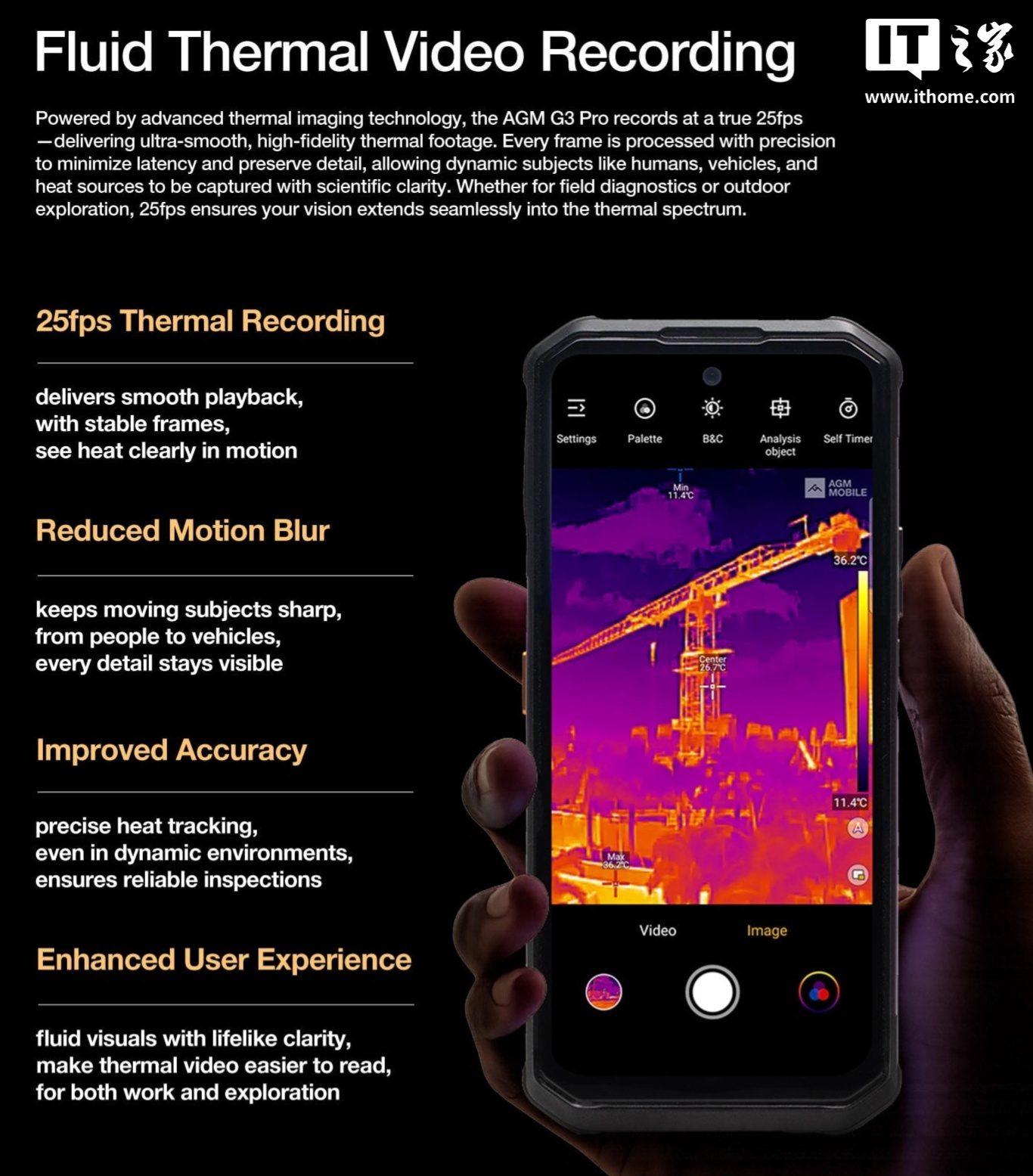 IT之家 11 月 16 日消息,AGM 手机官方今日继续预热 G3 系列新机国行版,本次介绍了 AGM G3 Pro 机型的热成像能力:新机支持 512×384 热分辨率、25Hz 热刷新率,拥有 57.6° 横向视场角、42.2° 垂直视场角、-20℃ 至 150℃ 低温测温范围和 100℃ 至 550℃ 高温测温范围。