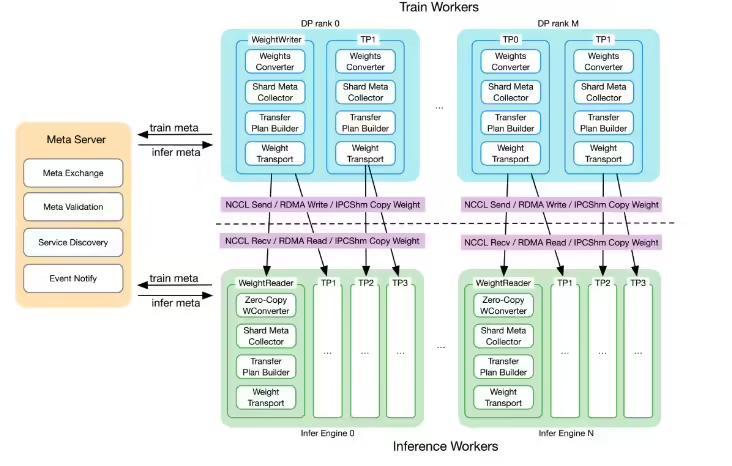 MetaServer:Job 级别全局 Server,用于训推引擎的服务发现和权重元数据交换,以及共卡情况下的事件通知等功能;